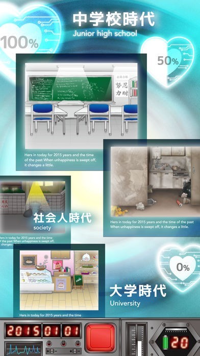 彼女の中学生時代や社会人時代に、タイムマシンを使ってタイムスリップすることができます。彼女の不幸の原因をなくすと彼女の見た目が変化します。彼女の変化はデータファイルに記録されます。