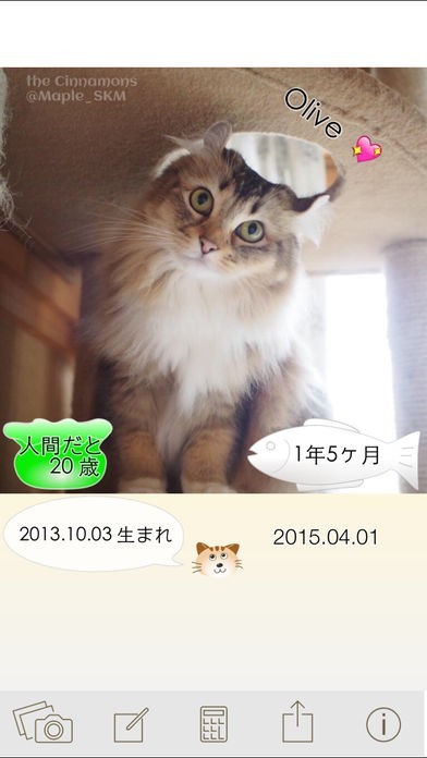 人間年齢(人間に換算した場合のおよその年齢)、猫の年齢(経過年月)、猫の生年月日、現在の年月日、がタイムスタンプとして表示されます。アイコンやテキストはドラッグで移動できます。