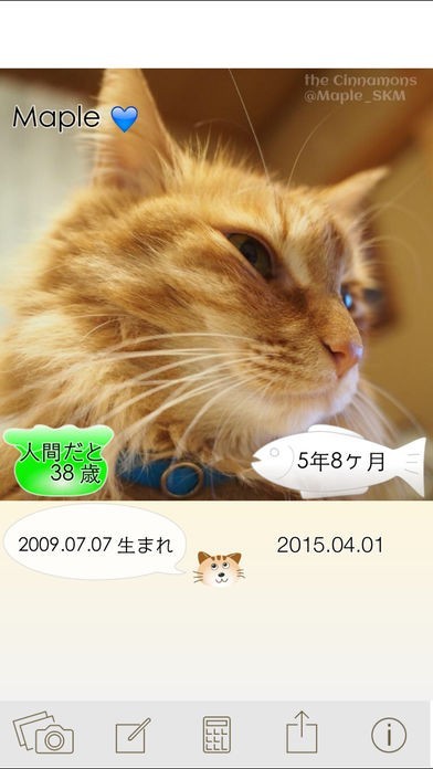 猫の生年月日を入力して、簡単に人間の年齢に換算できます。コメントを入れて写真として保存できるので、 ペットの成長アルバムとして利用できます。SNSにシェアも簡単!