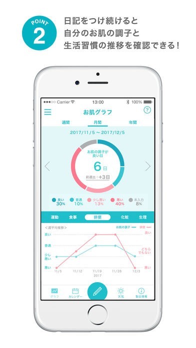 スマートフォンで肌に関する情報を記録しておくことができるアプリとなっていて、お肌グラフで肌の状態や生活習慣などをグラフにして一目でチェックすることも可能となります。