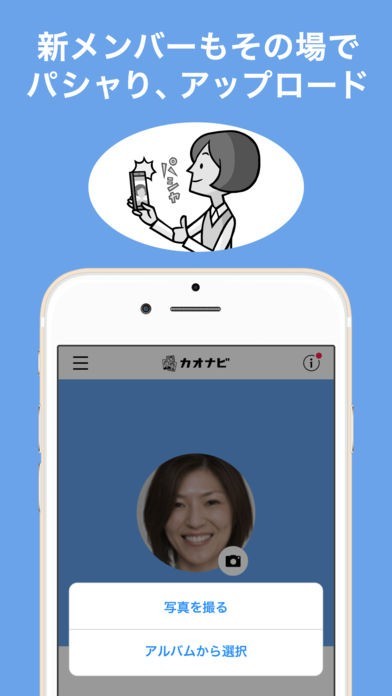 顔写真がなくても、自分でアプリから直接写真を撮影し、カオナビにアップできるので、人事担当も手間いらず