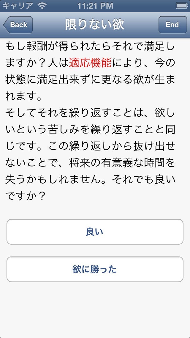 App Storeより引用対話形式で自分の欲望を観察し、コントロールするアプリです。