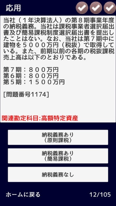 消費税法をクイズ形式で学べるスマホアプリ。基本的な内容から専門家レベルの問題までを収録