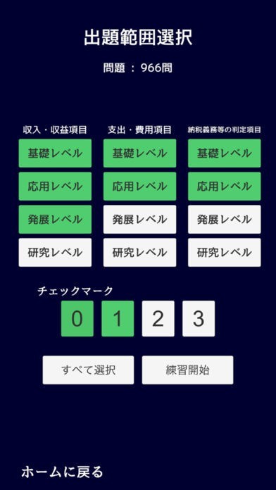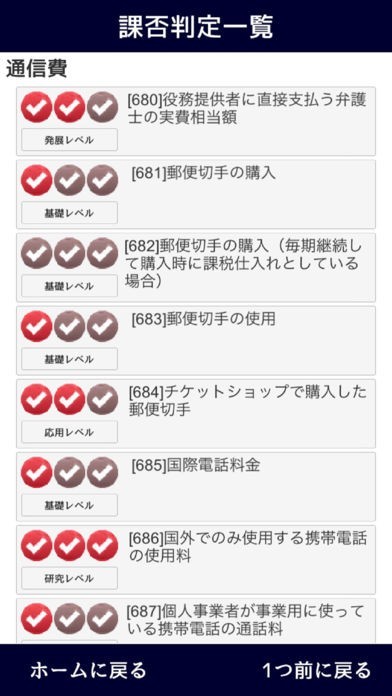 消費税法の収入・収益項目、支出・費用項目の問題が全部で1000問収録されています。問題は基礎・応用・発展・研究の4レベルに分かれているので、自分のレベルに合わせて問題に答えていくことができます。選択肢の中から正解だと思うものをタップするだけの簡単操作なので手軽に問題を解いて行けます。問題ごとに解説が付いているので間違っても分かりやすく理解を深められます。難易度順に並んでいる30問を解答していく無敵モードが搭載されているので、クイズ感覚で学習することもできます。税理士や公認会計士など消費税法に関する試験の合格を目指している方や経理の仕事をしている方に役立ちます。