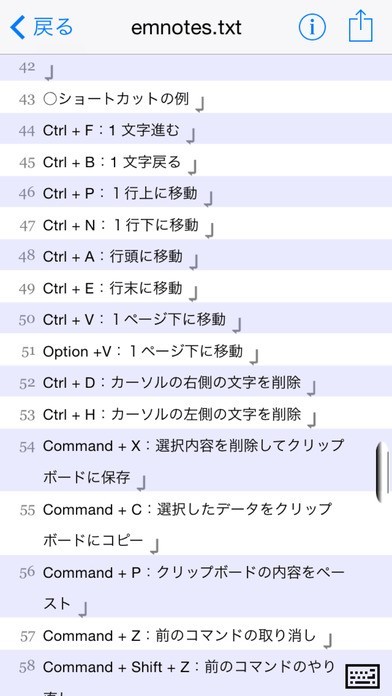 Macやemacsでおなじみのショートカットキーが使用できます。Ctrl-P/N/B/Fで上下左右にカーソル移動でき、Ctrl-Lでカーソル位置を中央に移動できます。Ctrl-Kでカーソル以降の文字を切り取り、Ctrl-Yで貼り付けが行えます。これらのショートカットが全て動くアプリは他にありません。em notes の最大の特徴です。