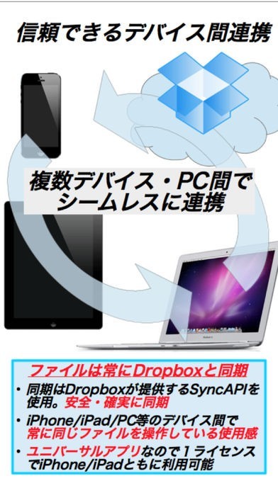 編集したファイルはDropboxと同期します。バックグラウンドで自動で保存・同期されます。iPhoneとiPadなど複数端末の間で同じファイルを共有することが可能です。パソコンからも使用できます。