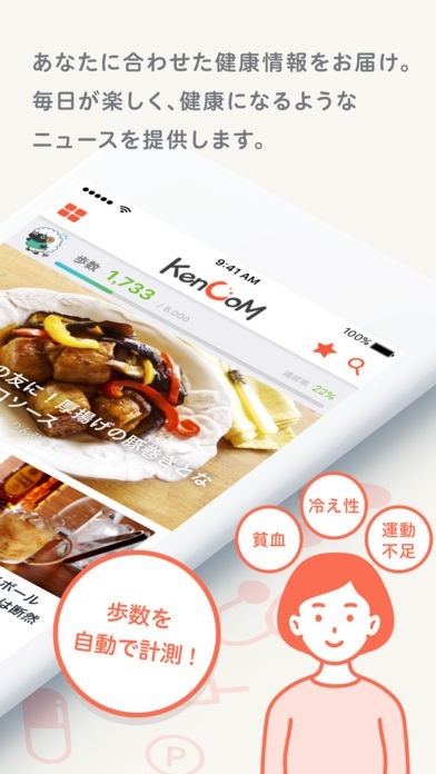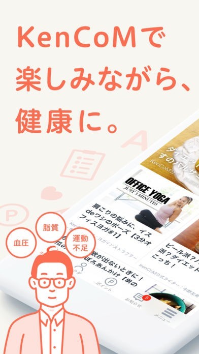 「KenCoM(ケンコム)」は、楽しみながら、自分に合った健康情報をチェックしたり、管理出来るアプリです。歩数を自動計測出来たり、体重や血圧、血糖値などを記録することが出来ます。更に、所属している健康保険組合からの大切な情報をお知らせする機能もあり、今まで知らなかったお得な情報をゲットすることも出来ます。大手企業でも社員に推奨、紹介していて、健康管理にはもってこいのアプリです。