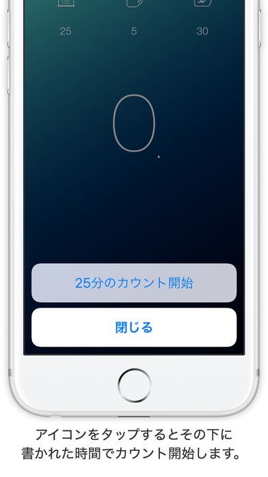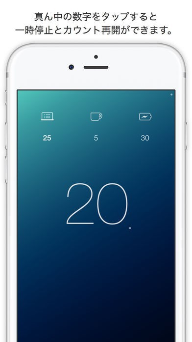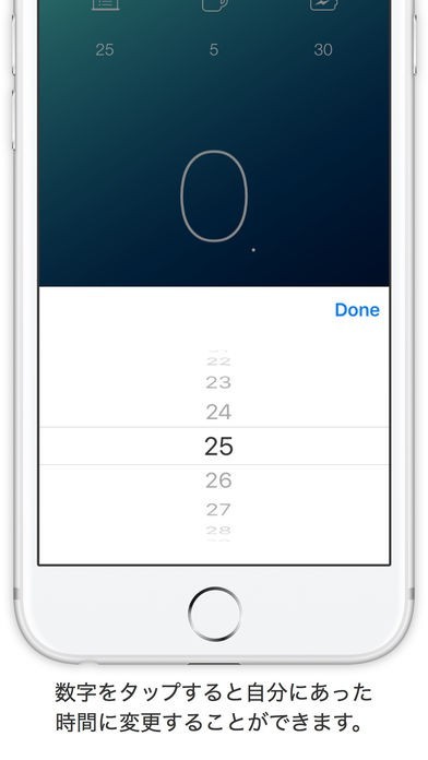ポモドーロ・テクニックとは、25分作業した後、5分休憩を繰り返し行う時間術のことです。人間が作業に当たる時、時間と共に集中力は下がってしまいます。そこで集中力が下がり作業効率が落ちてしまう前に休憩をすることで、集中力を回復させ効率的な作業が行うことが可能になります。そんな時間術を手軽に取り入れられるようにサポートしてくれる機能が本アプリには搭載されています。