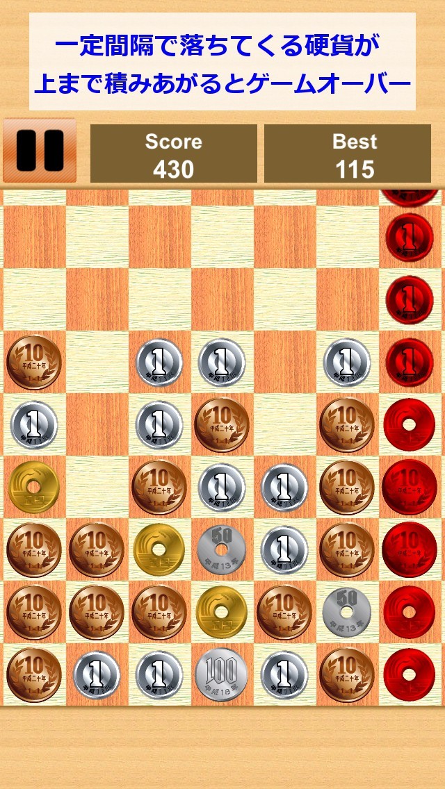 週間アスキーの熱血!!Appバトル月間MVPに輝いた「パズ銭」は5秒でルールを覚えることが出来るシンプルなゲームながら不思議とはまってしまう魅力を持ったパズルゲームアプリとなっています。このアプリは画面上部から落ちてくる小銭が一番上まで積みあがる前に消していくタイプのパズルゲームとなっていて、同じ硬貨を指でつないで両替して消していきます。日常的によく使う日本の硬貨を使用しているのでルールを覚えるのも簡単になっています。
