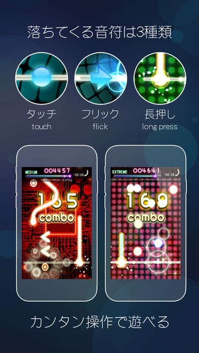 登場する音符は3種類!曲を切り替えながら簡単操作で遊べる!
