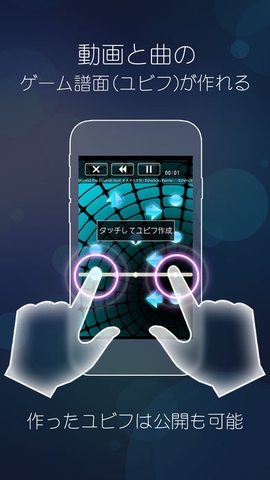 「ユビフ」と呼ばれるゲーム譜面の作成機能を搭載しており、オリジナルのユビフを作って楽しめるのが特徴です。ガイドに合わせて操作するだけで、簡単に自分だけのユビフが作成できるため、とっておきの譜面を作り上げることができるでしょう。また、SNS機能を利用すれば、完成したユビフを友達にシェアして、皆で一緒に盛り上がることもできるようになっています。