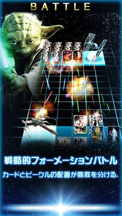 トレーディングカードゲームでは、ヨーダ対ダース・ベイダー、ダース・モール対ルーク・スカイウォーカーなど、夢の対決が実現する!独自のフォーメーションを組み、他のプレイヤーをPvPで攻撃しよう。各カードには、スキル、攻撃レンジ、フォース属性のコンビネーションが特有に存在。カードの力を最大限に発揮するフォーメーションを構築し己の強さを見せつけるため、他のプレイヤーへ戦いを挑め!
