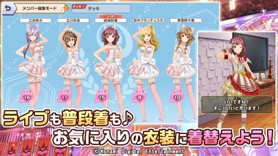 ライブステージでの衣装を自由に着せ替えてアイドルを可愛くプロデュースすることができます。ステージ以外の寮生活中の私服も着せ替えることができるので、単純に着せ替えだけを楽しむこともできます。
