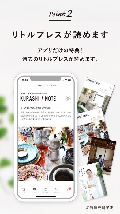 アプリだけの特典として、当店でお買い物した方のみに同梱プレゼントしている『暮らしノオト』と『オトナのおしゃべりノオト』のバックナンバーを公開。特別なデザインでお楽しみいただけます。(2019年以降の一部に限ります。なお最新号は引き続き商品ご購入者のみにお届けします)
