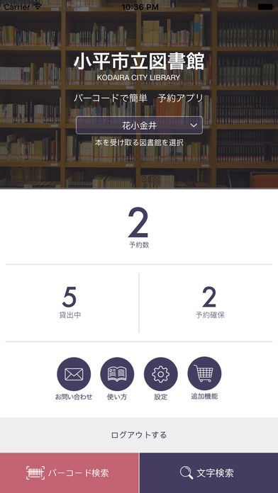 App Storeより引用小平市立図書館のバーコード書庫検索・予約アプリです。
