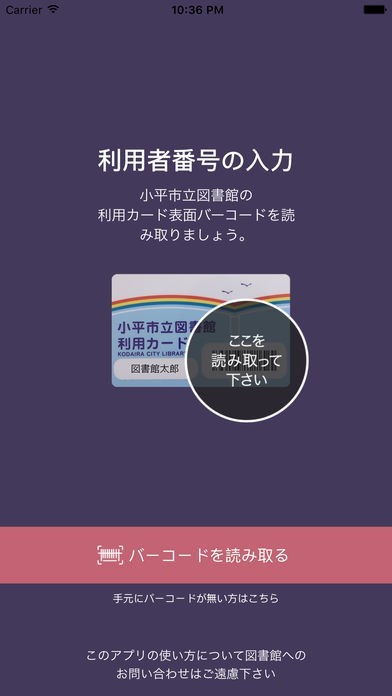このアプリは小平市立図書館利用カードがないとアプリを使うことはできません。