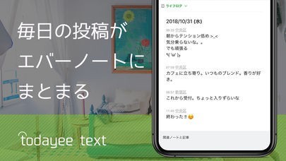 todayee(トゥデイー)は「日常を残そう」をコンセプトに生まれた新しいタイプのエバーノート投稿アプリです。写真や音声、ビデオ、地図、テキストなど用途に合わせた様々なアプリをご用意しています。"todayee"で検索してみてください。