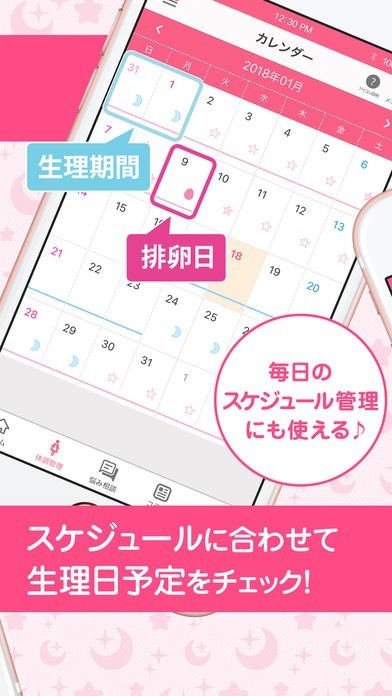 スマートフォンを使って生理日を管理することができるアプリとなっていて、整理になったらアプリに入力することによって次回の生理予定日や排卵予定日などを予測してくれます。