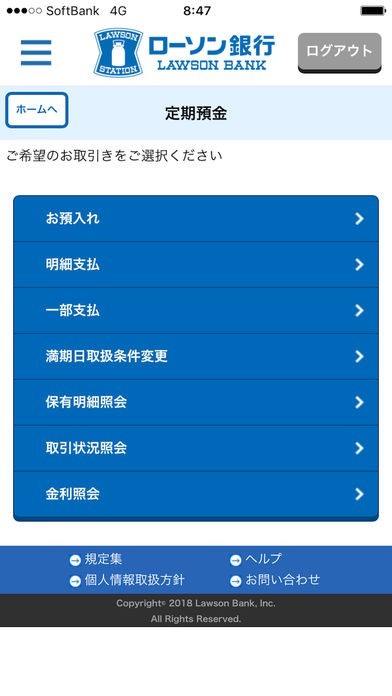 このアプリケーションでは、ローソン銀行による定期預金も簡単に管理することができます。預金の預け入れはもちろん、明細支払いや取引状況、管理状況もアプリ内で確認できます。