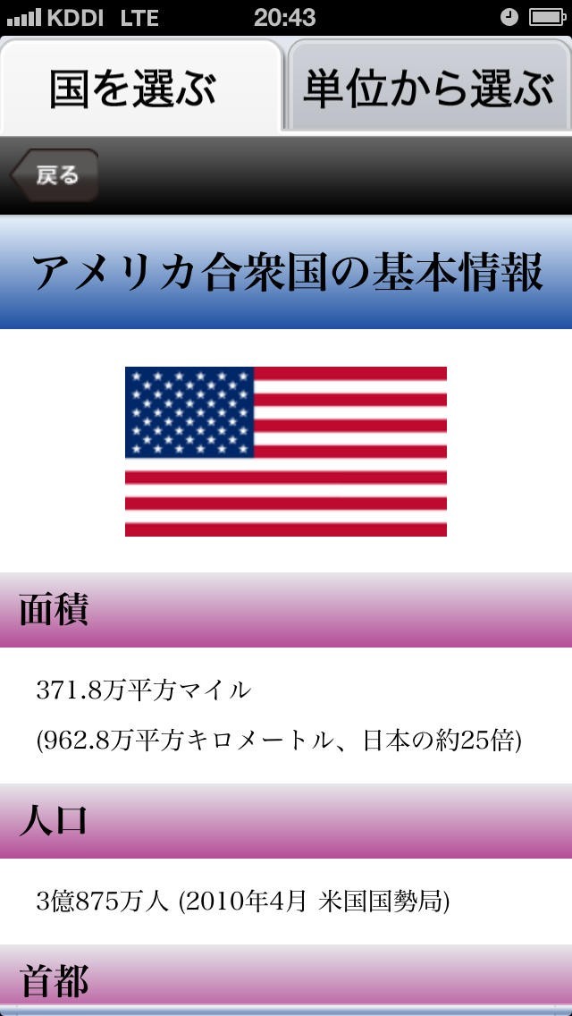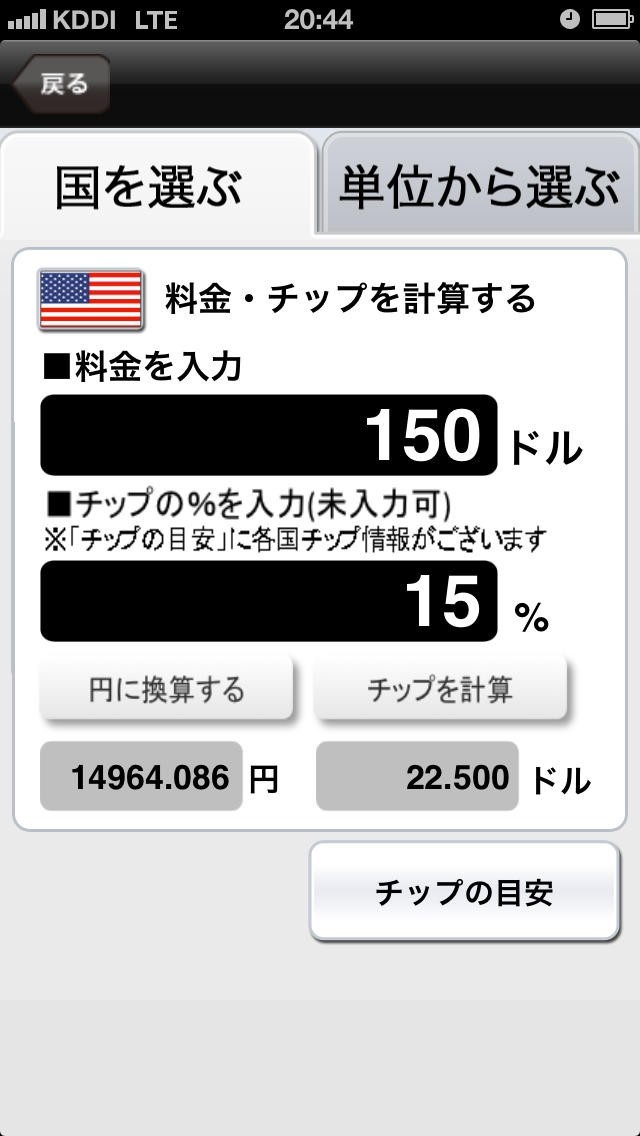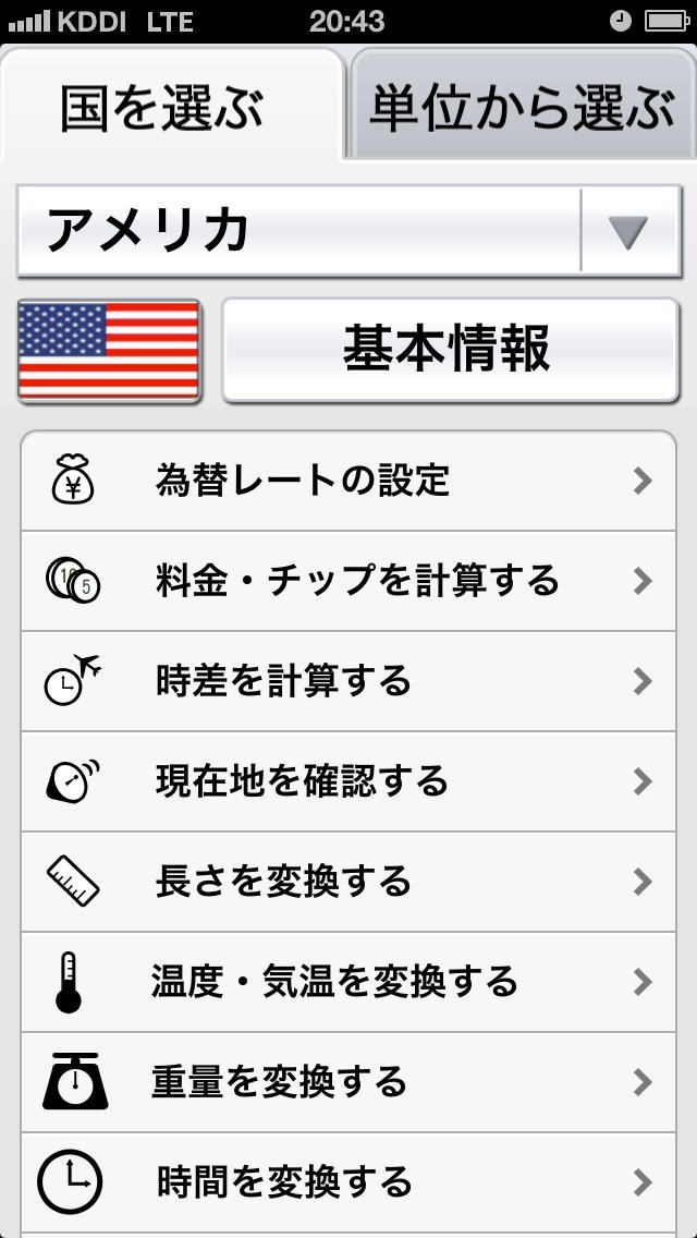 海外旅行便利アプリは、外国と日本で異なる単位(長さ、重量、通貨、温度、為替、電力、圧力、放射能、体積、速度、面積、時間など)を変換してくれるアプリです。調べたい国を選択するとその国の面積や人口など基本情報が表示されます。更にその国内で使われている単位を選んで数値を入力すればすぐに日本の単位と変換して表示してくれます。日本人では慣れないチップの計算もしてくれるので、旅先で慌てて計算しなくても済みます。海外旅行に行く前にダウンロードしておくと安心なアプリです。