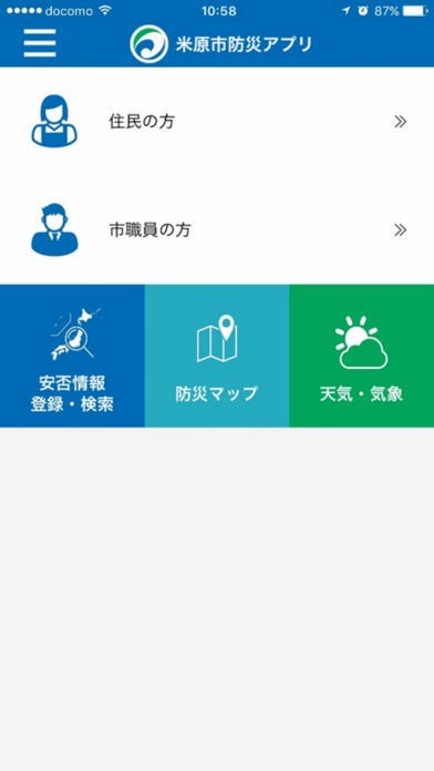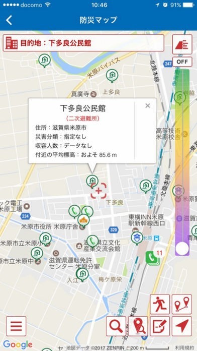 米原市防災アプリは米原市が提供する防災アプリで、市内の地図をベースに標高表示がなされ、避難所や公共施設、公衆電話の位置も表示される防災マップの掲載がされており、米原市の災害情報や緊急情報、市からのお知らせの受信や、選択した自治会からのお知らせを受信することが可能です。また、気象情報の閲覧も可能です。