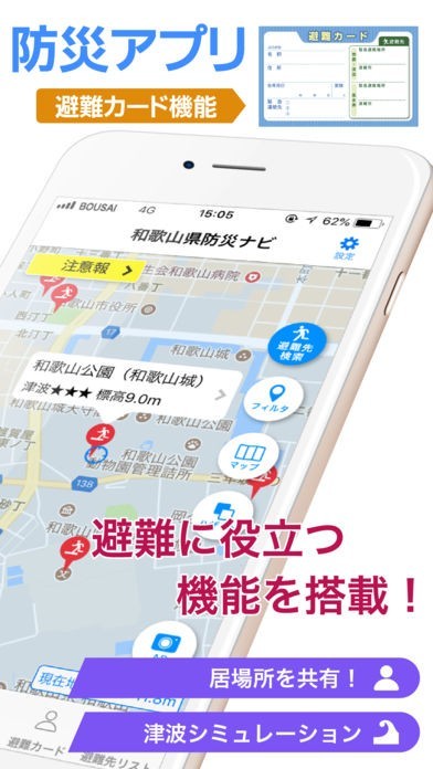 App Storeより引用防災ナビには避難に役立つ様々な機能を搭載しています。避難先検索の他、家族の居場所確認や避難トレーニングなどもできますので、ぜひご活用ください。