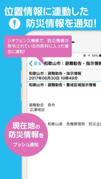 ・事前の登録なしで、気象警報・注意報や避難勧告等の防災情報がプッシュ型で届く。