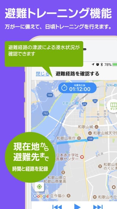 ・避難場所の安全レベルも確認でき、最短ルートを地図上に表示。