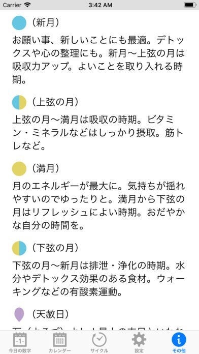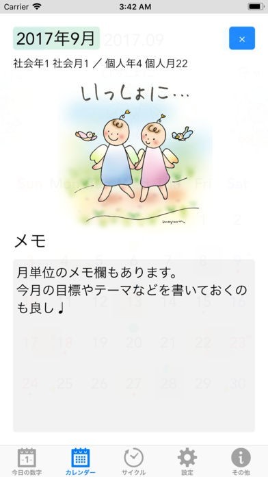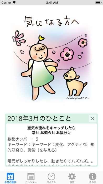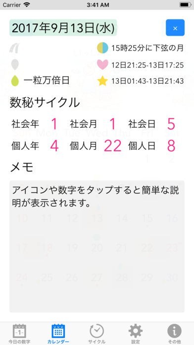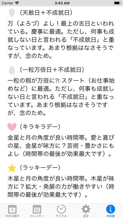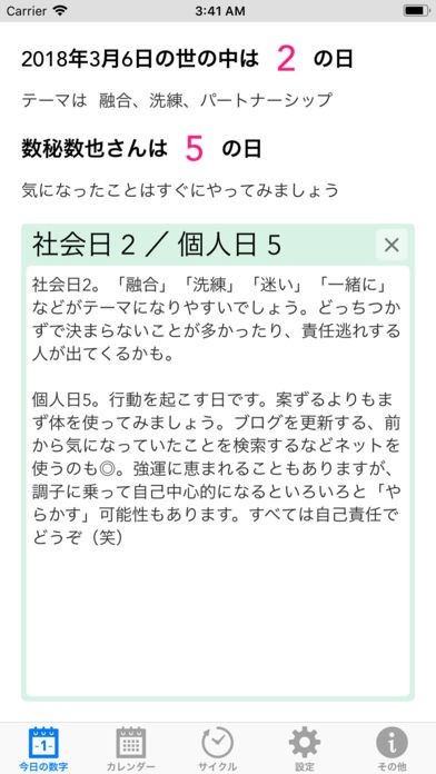 このアプリは、数秘術に基づいて作成されたカレンダーアプリです。数秘術と天体の動きを知ることで、その日の運勢を知ることができます。これであなたの不安はきっとなくなるはずです。