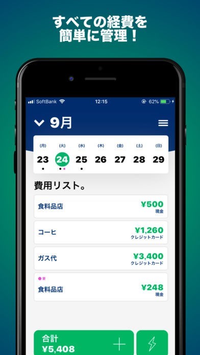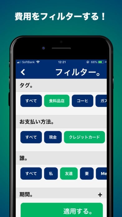 数え切れないほどの項目を追加しても、全く心配いりません。商品や支払い方法、期間や経費を使った人で簡単に検索することができます。例えばタグを「クレジットカード」に設定すれば、カード払いの経費のみが表示されます。