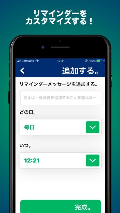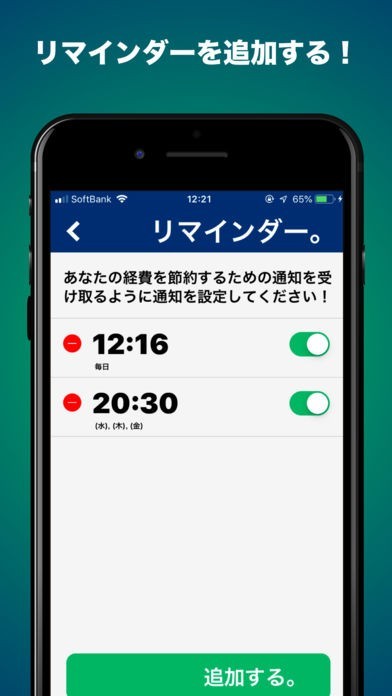 ユーザーの経費を節約するため、リマインダーを設定して通知で受け取ることができます。リマインダーでは、メッセージと、どの日に受け取るのか、何時に受け取るのか、などを設定できます。