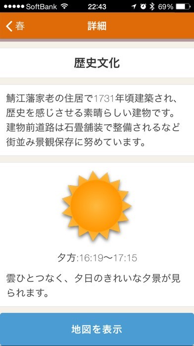 鯖江は福井嶺北地方中央部に位置する市で、四季によって顔を変える美しい景色が観光客に支持されています。「鯖江夕景」はそんな鯖江の夕景に特化したアプリで、ポイントは天気予報と連動している点にあり、タイムリーな当日の情報が入手可能です。訪問経験がある人はこれまでとは違う新しい鯖江を発見することができ、初めての人は四季ごとの名所案内を読み物として参照できます。また、名所の案内ページから地図表示が可能となっていますので、現在地からのアクセスや到着予想時刻といったスケジュール管理も可能です。