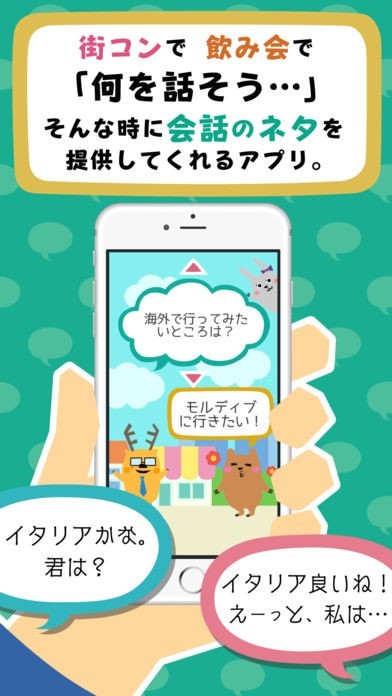 「会話ネタアプリ「モテトーク」」は、合コンや飲み会で気軽に使える会話ネタを多数提供してくれる婚活アプリです。 タップするだけで素早くネタが表示されるので、もう異性との会話に困ることはありません。 イラストをたくさん使った可愛いデザインで、婚活アプリだということが周囲にバレにくいのも嬉しいポイントです。 もちろん、話題を提供するだけのアプリではありません。 会話術や異性からの印象を良くするコツなど、合コンに向けての心構えを教えてくれるのも特徴です。 これから合コンに行く予定の方、異性と会話するのが苦手な方におすすめできるアプリです。