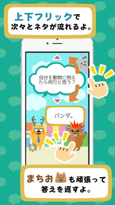 かわいいキャラクター“くまお”たちと一緒に、恋愛や遊びに役立つトークスキルをどんどん高めましょう。上下にフリックすると次々と会話ネタが変化するので、バリエーション豊富な会話ネタに1人で向き合うことでトークスキルを上げてどんな内容でも鋭く切り返して場を盛り上げたり、その場でアプリを持ち出して会話のネタにしたり、“くまお”のユニークな返答を楽しんで暇潰しにするのもよしと様々な使い方が可能です。“うさピ”によるトークレッスン機能を使えば、うさピから理想の相手をゲットするためのモテトーク技術を学ぶこともできます。トークスキルをアップして、更に聞き上手になることで、初対面の異性とでも楽しく話せるようになりましょう。