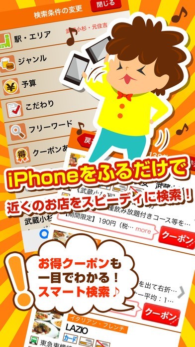 簡単操作でお店探し!スマートフォンを振るだけでクーポンを取得!