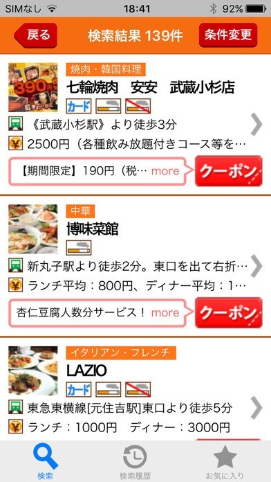 履歴検索機能を搭載しています。もう一度行きたいお店は履歴から素早く検索可能。再検索の手間を省きながら、営業時間やクーポンのチェックを手軽に行うことができるようになっています。