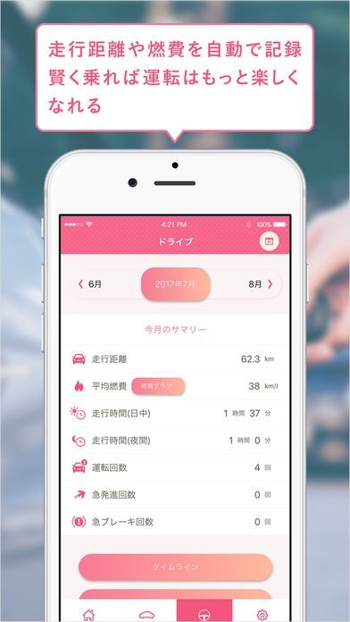 ※記録された走行距離や燃費、経路をカレンダーやタイムラインで見やすく表示