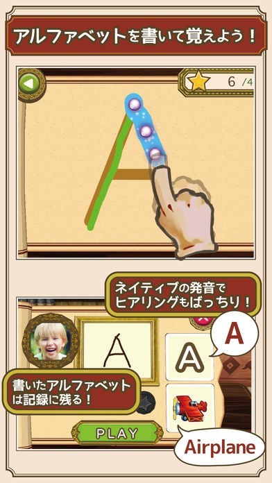遊びながら楽しくアルファベットを学ぶことができる英語導入に最適の学習アプリ。子供が書いたアルファベットアプリは保存でき、ネイティブの発音で耳からも英語が入ってきます。単語を書く、読む、聞く、タイピング、パズルなど様々なゲームが用意されているので飽きることはありません!すべてのステージをクリアすると感動のエンドロールが待っています。親子で最後までゲーム感覚でアルファベットを覚えましょう。人差し指で文字を書ける方ならどなたでも遊ぶことができますよ!