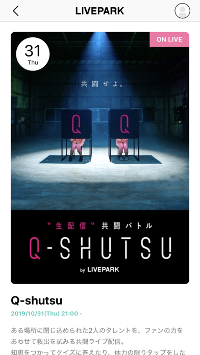 App Storeより引用「LIVEPARK(ライブパーク)」では、普段ご覧頂いているテレビ番組と連動したライブ配信や、オリジナルのクイズや投票、謎解きなどのみんなが参加できる楽しいライブ配信イベント楽しめる新しいライブ配信アプリです。