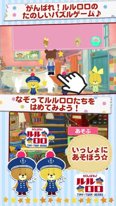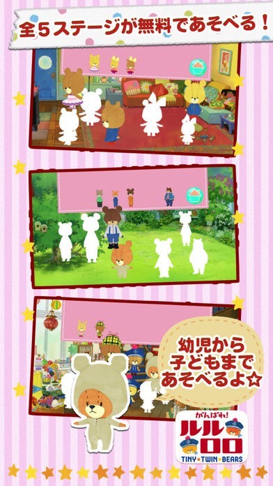 ルルロロの楽しい音楽に合わせて可愛いキャラをなぞってシルエットにはめる簡単操作の知育ゲームです。