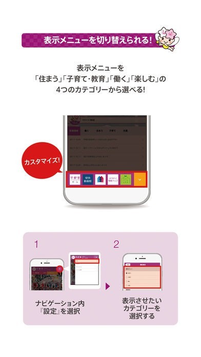 「住まう」、「子育て・教育」、「働く」、「交流」の4つのカテゴリの中から自分がほしい情報をプッシュ通知で受け取れることができます。