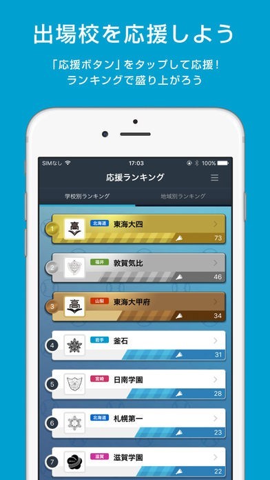 応援ランキングでは出場校がランキング形式で表示され、ユーザーに人気の高校が判りやすくなっています。自分の出身校が何位かチェックしたり、ランキング上位の高校を応援してみたりと、大会をさらに盛り上げるために役立ちます。
