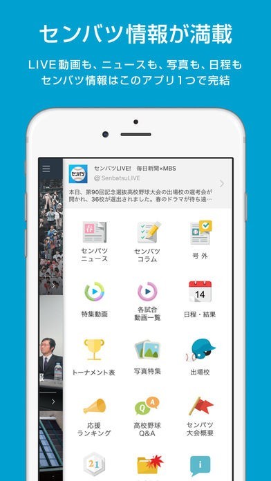 選抜高校野球が公式配信するアプリ「センバツLIVE!2017」では、大会をより楽しくするコンテンツを多数用意しています。 大会に関する最新ニュースや情報を随時配信する他、参加校について詳しい情報がチェックできるのも嬉しいポイント。 「号外」として紙面号外なども掲載され、高校野球ならではの熱い展開を美麗な写真付きで満喫できます。