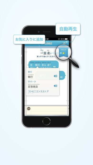日常生活で使用する中国語を搭載しています。ビジネスや自己紹介、恋愛結婚など60シーン以上に分かれているので、使いたい言葉が見つけやすい仕組みになっています。全部で1500以上ものフレーズを搭載されており、ネイティブによる発音も聞くことができるので便利です。使いたい言葉を長押しすると大画面で表示される機能もあるので、指さしなどもしやすくなっております。