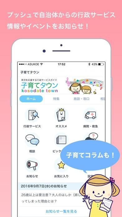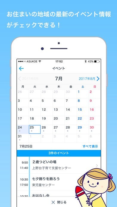 全国の自治体が行っている子育て支援について情報が掲載されています。周辺地域でのイベントな情報についても更新されるたびにお知らせアラームで案内をしてくれます。またスケジュール表もあるので予防接種や子供のイベントについても記録することが可能です。子育てについて困っている事や悩みの相談ができる機能も備わっています。