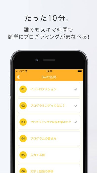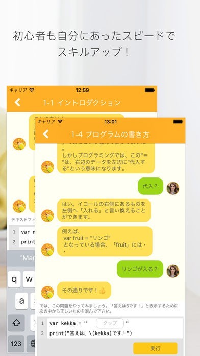 今年のベストApp 10選にも選ばれた「codebelle」を使うことによって、短時間でプログラムを学ぶことが出来ます。 まったく理解していない方でも基礎から勉強することができるので、参考書などを買う前に試しに学習してみるののに向いています。よって、ターゲットはプログラムに興味を持っているすべての方々があてはまります。 細かな単元に分けられており、一区切りわずか10分で学習することが出来ることから、通勤時間や休憩時間などにコツコツと積み上げて学んでいくことが出来ます。 また、学習はチャット形式で行えるので、ありふれた苦しい勉強とは全く違った楽しい気分で進めていくことができ、挫折してしまう可能性を減らすことが出来ますし、どんどんと興味深いと感じさせてくれるようになり、自分のペースで学習していくことが出来ます。