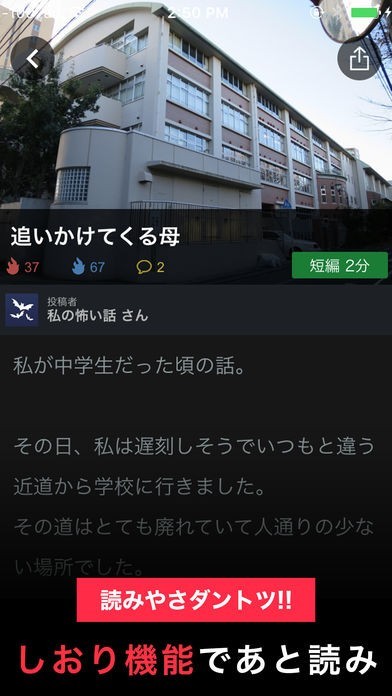 App Storeより引用実体験の怖い話、不思議な話、怖いけど感動する話が閲覧・投稿できるアプリです。
