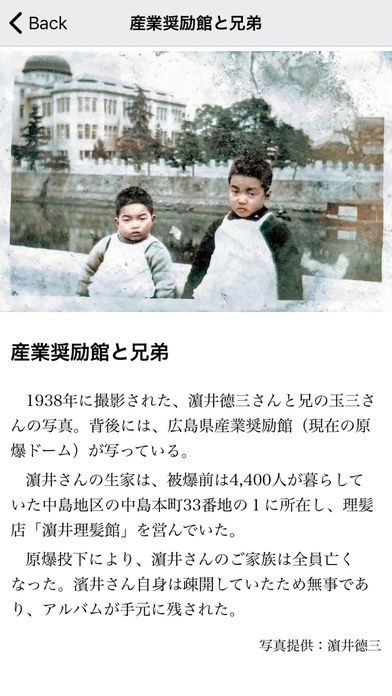 現在の広島平和記念公園は,戦前は4,400人が暮らす繁華街・中島地区でした。かつてあった平和な暮らしは,一発の原子爆弾で永遠に失われました。本アプリに掲載されている写真は,主にこの中島地区で撮影されたものです。