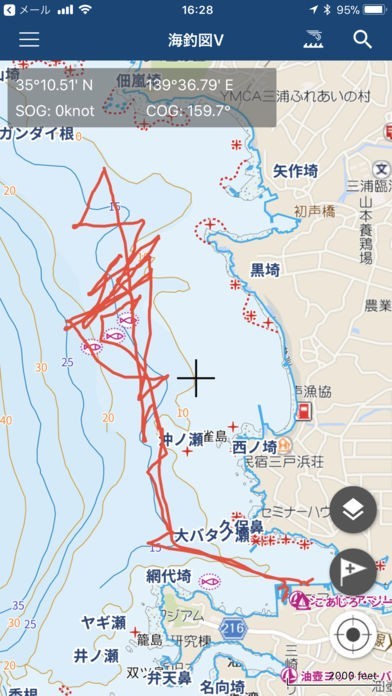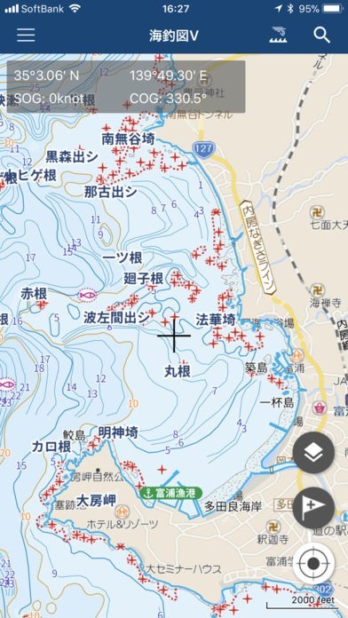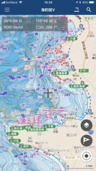 周辺の魚礁や根などをを探すことができるので、爆釣りできるポイントを探すことができますし、水深も表示してくれるので予想をしながら釣ることができます。また「マリーナ」「海の駅」などの情報を教えてくれるので、周辺の施設のことも理解できます。