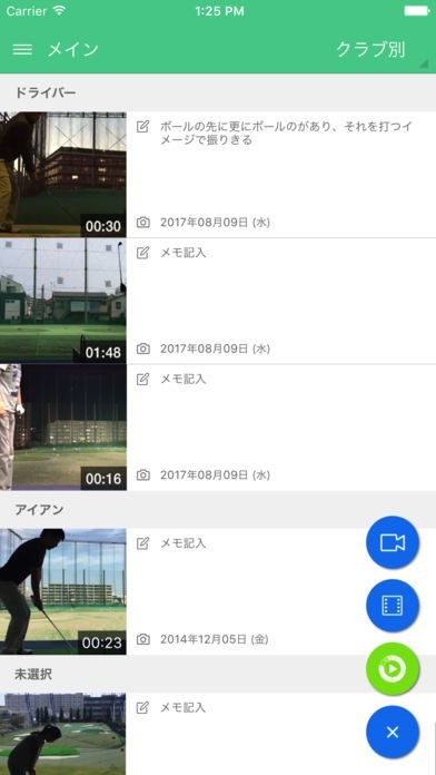 並び変え機能があり、クラブ別や撮影日毎に並べて確認できるので、その時の調子がわかり改善につなげることが可能です。 動画を拡大や縮小して、フォームを整えていきたいときに便利です。